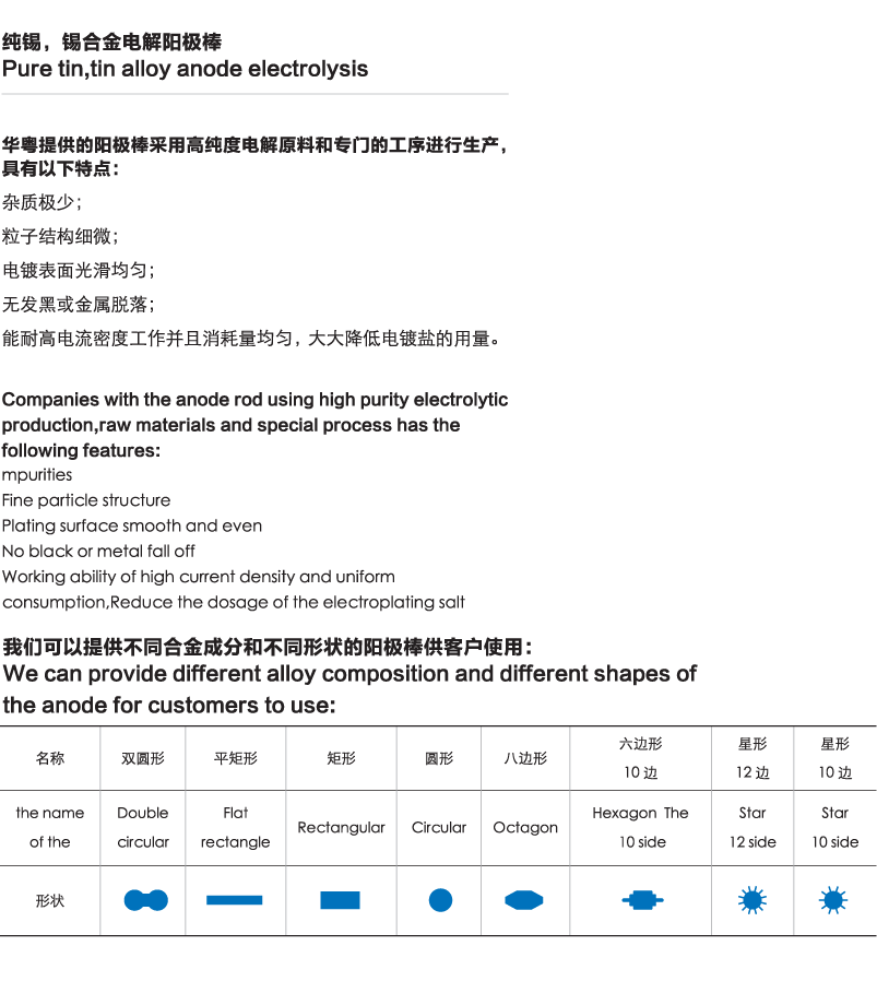 產(chǎn)品詳情>> 純錫/錫合金電解陽極棒